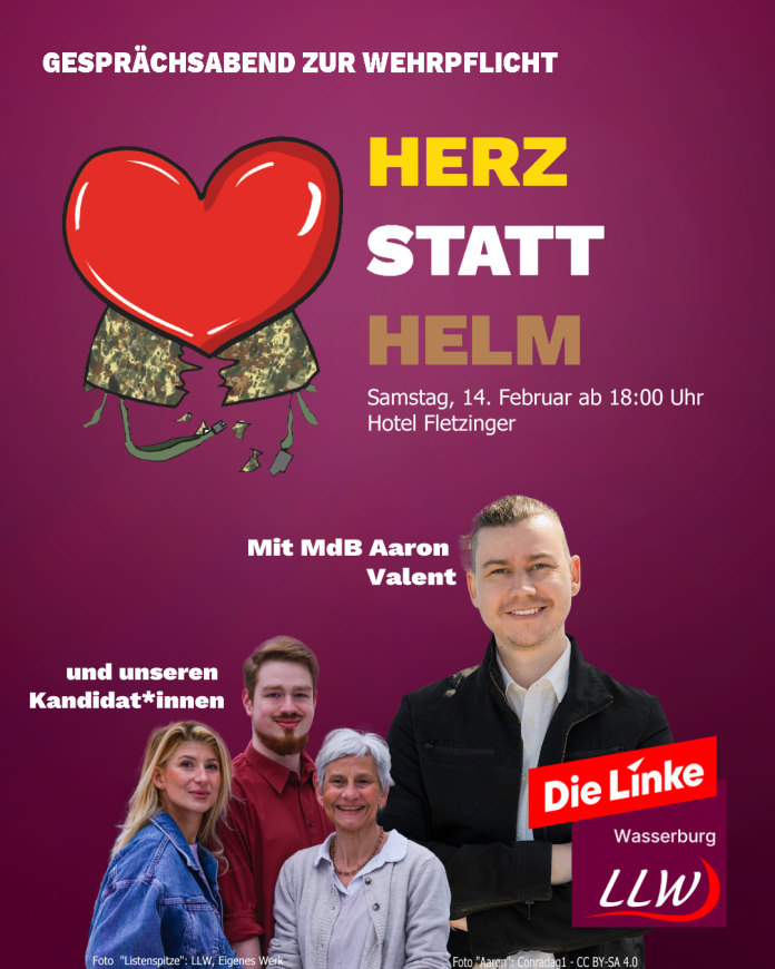 Wasserburg a. Inn, 12.02.2026 – Die Debatte um eine mögliche Wiedereinführung der Wehrpflicht ist zurück und betrifft weit mehr als nur die Bundeswehr. Unter dem Titel „Herz statt Helm“ lädt Die Linke Wasserburg / Linke Liste Wasserburg (LLW) am Freitag, 14. Februar, um 18:00 Uhr zu einer öffentlichen Informations- und Diskussionsveranstaltung ein. Zu Gast ist der Bundestagsabgeordnete Aaron Valent.